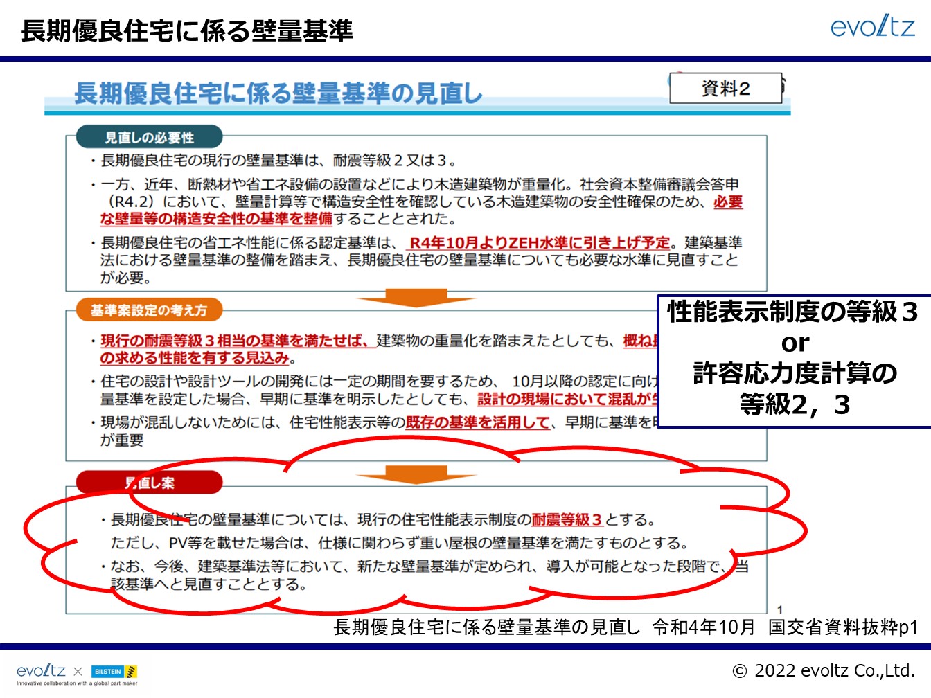 ・現行の耐震等級3相当の基準を満たせば、建築物の重量化を踏まえたとしても、概ね長期優良住宅の求める性能を有する見込み。