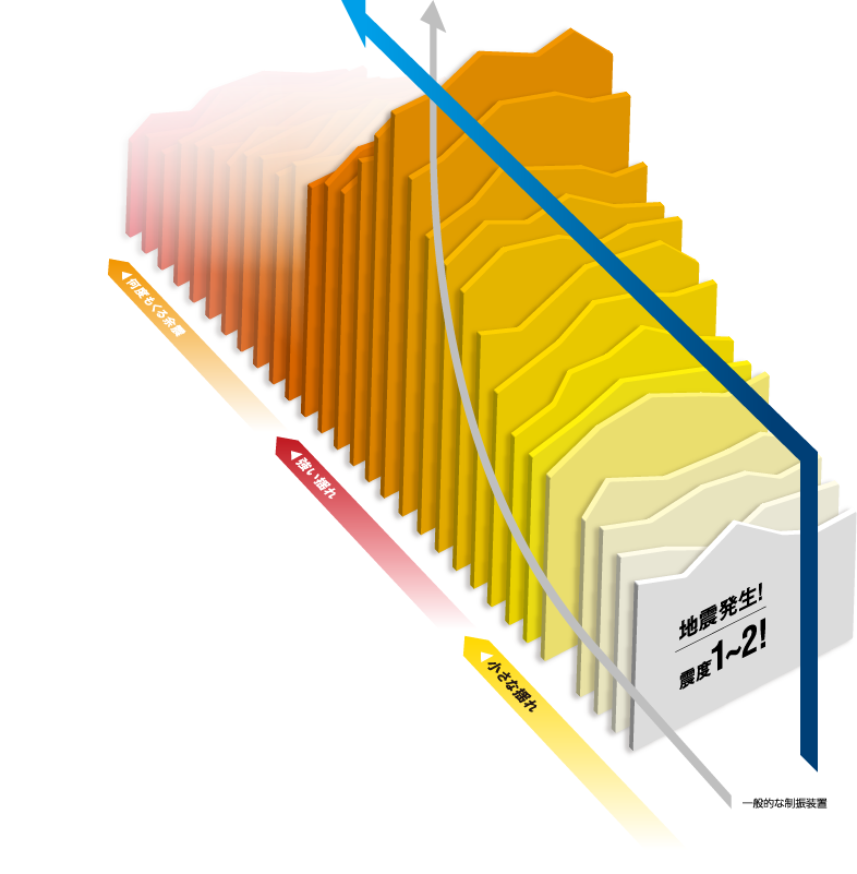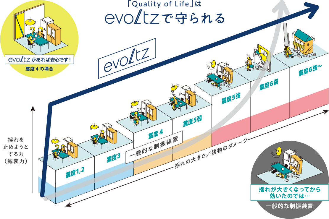 evoltzは地震の揺れ始めから性能を発揮し、ごく僅かな揺れでもしっかりと地震のエネルギーを吸収します。