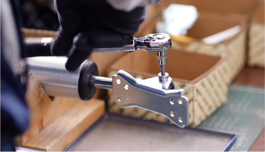 日本国内に運ばれてきたevoltzを1本1本手作業でブラケットを組み付けます。